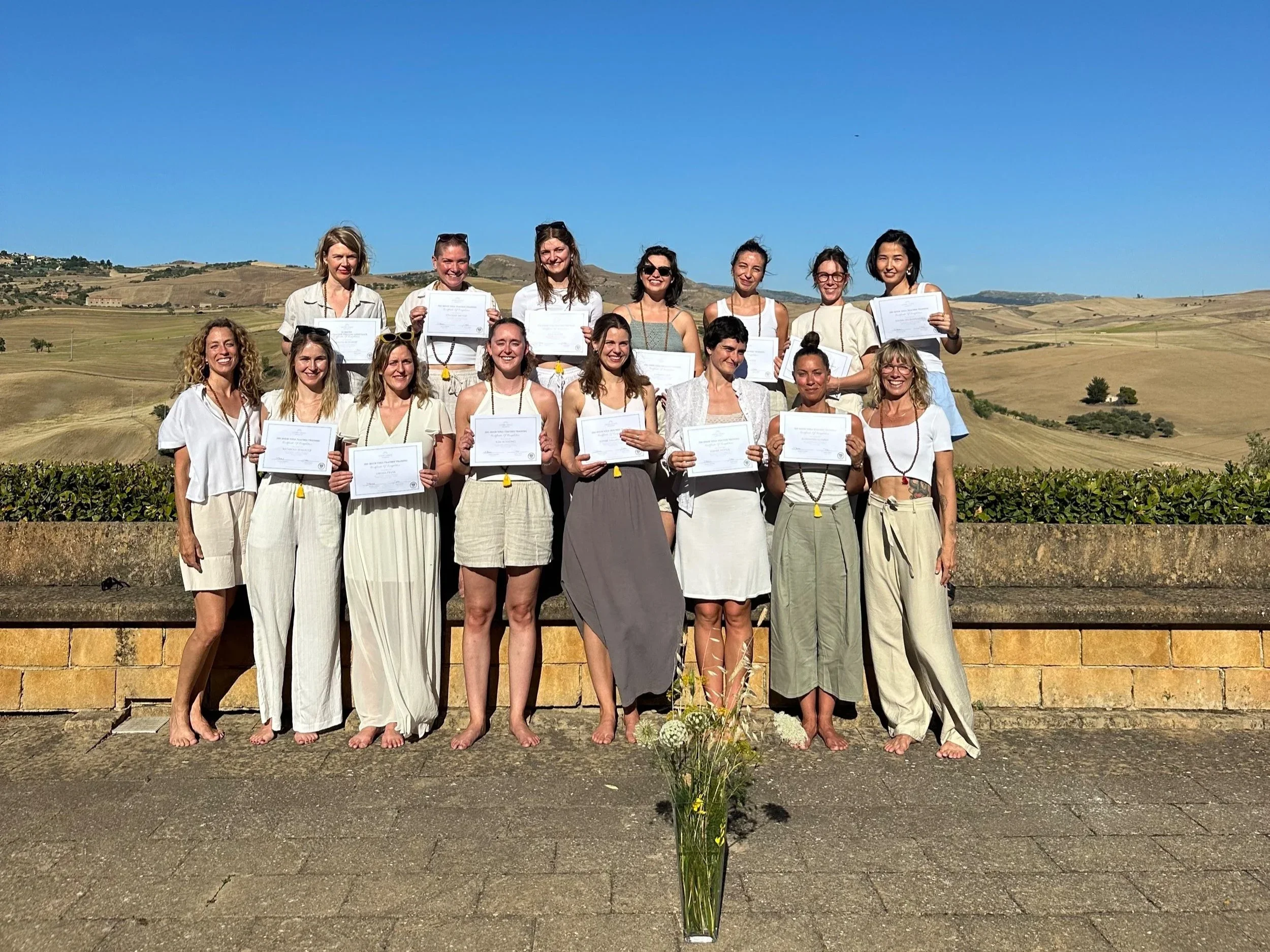 Our program offers a flexible, balanced approach. We meet live online once a month via Zoom for immersive sessions covering yoga asana, philosophy, history, anatomy, and more. Additionally, there's a monthly live online masterclass. The training concludes with one week in Sicily, Italy, where you'll practice, receive guidance, and take your final exams. It's a transformative blend of online and in-person learning.